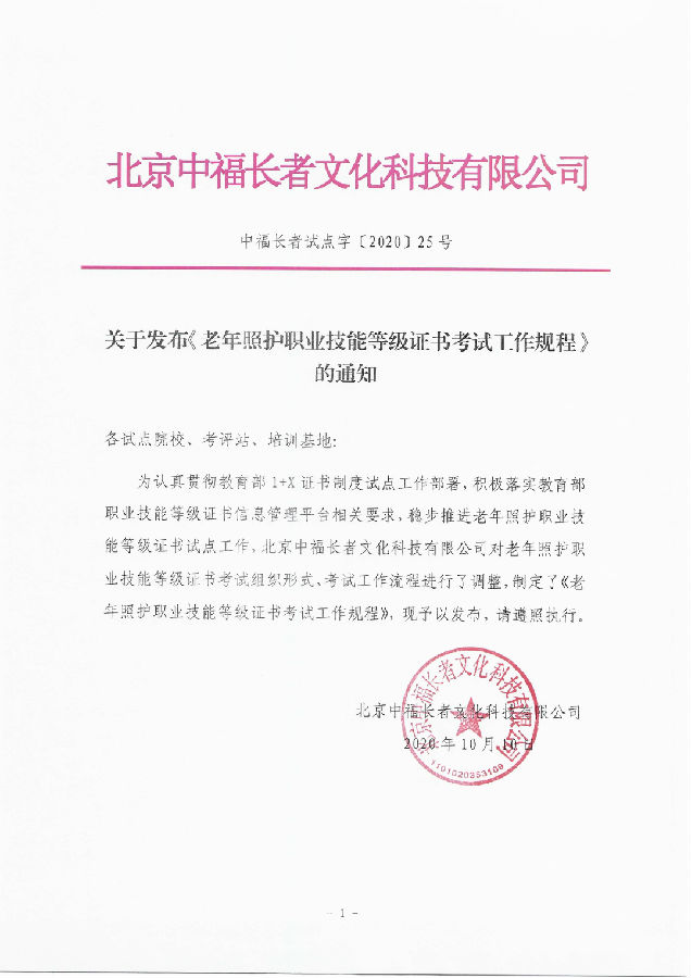 中福长者试点字【25号】关于发布《老年照护职业技能等级证书考试工作规程》的通知