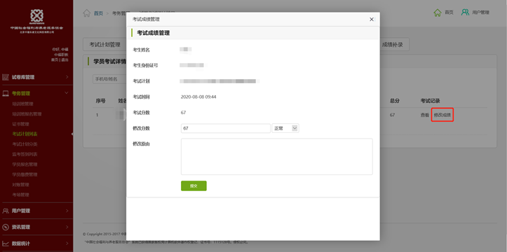 2.考试结束后若对考试成绩有异议,立即向质量督导中心上报,经批准后由考评站信息管理员在后台点击修改成绩,为考生修改考试成绩,同时填写修改原由,系统会对此项操作做留存记录,以便后续核验考试成绩的有效性和真实性。