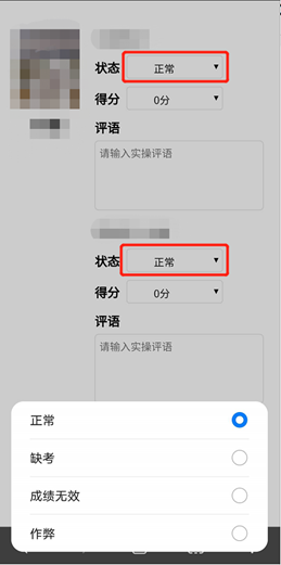4.考评员需在每组考生考试结束后实时在中福职教考试平台录入分数,同时,记录好纸质成绩。如果考试中出现特殊情况,需在状态栏中选择“缺考”“作弊”“成绩无效”等操作;