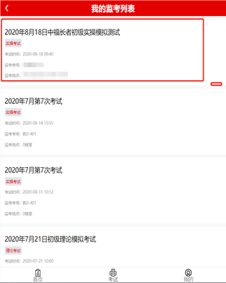 1.考评员在考试前登录考评工作人员账号,进入监考列表找到需监考的考试场次;