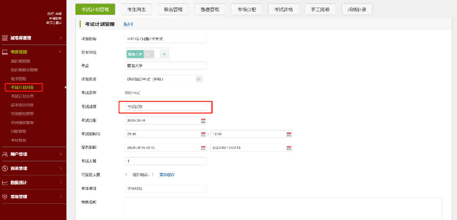 3.补充完善考试计划中的考试试卷、考评工作人员等信息,保存考试计划。如果考试计划中存在多个考场,保存后系统会随机分配考评工作人员监考考场。