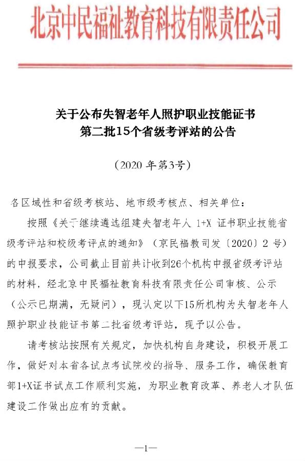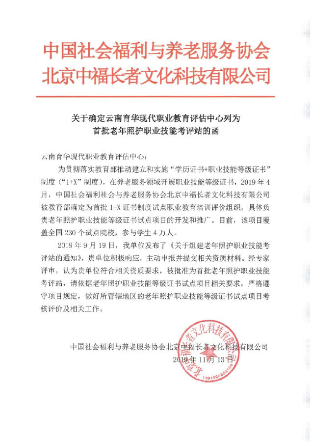 近日,云南育华现代职业教育评估中心成功申请成为失智老年人照护职业技能等级证书省级考评站,这也成为评估中心继2019年10月申请成为首批试点证书之一——老年照护职业技能等级证书云南考评站之后,承接的第二个教育部1+X职业技能等级证书省级考评站。
