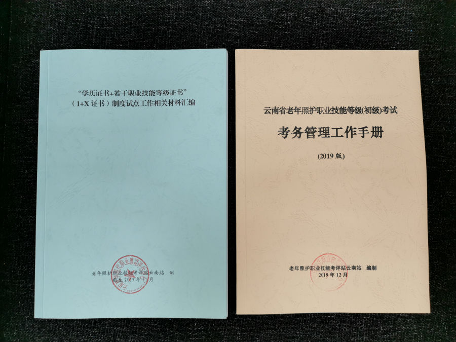 经过整理归纳梳理编制截至2019年11月的《“学历证书+若干职业技能等级证书”(1+X证书)制度试点工作相关材料汇编》,根据本省考评点的需求结合考评材料与系统模拟实际情况,编制了《云南省老年照护职业技能等级(初级)考试考务管理工作手册》,收集各考评点对于考务工作的集中问题在考前印制了《老年照护职业技能初级考试备忘录》。