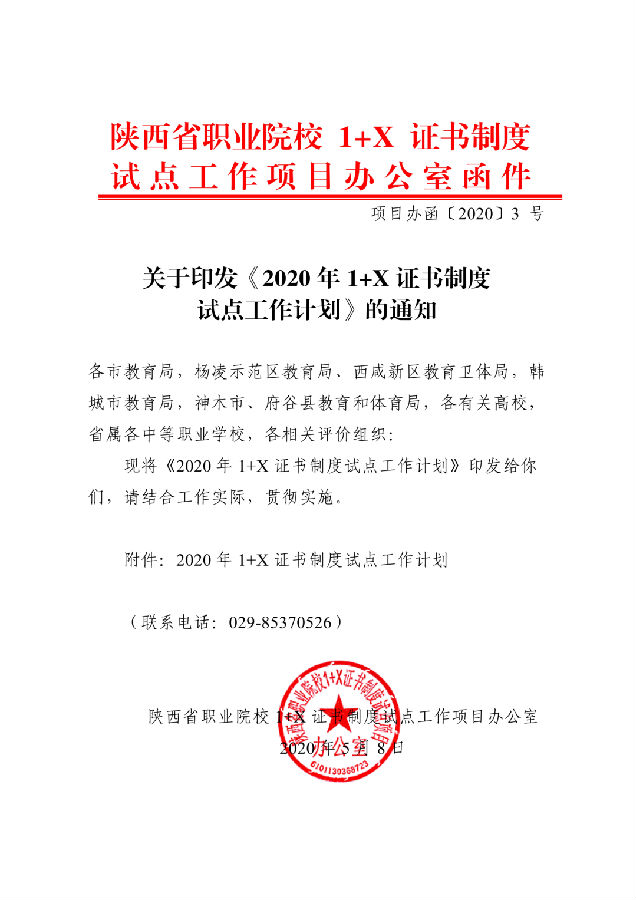 1、落实《陕西省教育厅办公室关于建立职业院校“1+X”证书制度试点工作指导协调机构的通知》( 陕教职办[2019]6号)精神,加强项目办公室和中、高职工作组建设,明晰工作职责,制定工作标准,规范工作流程,搭建工作平台,有序推进试点项目。