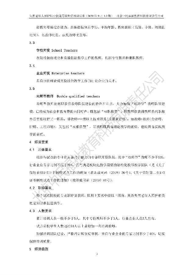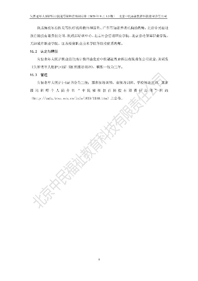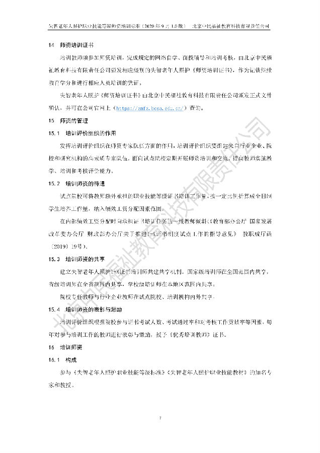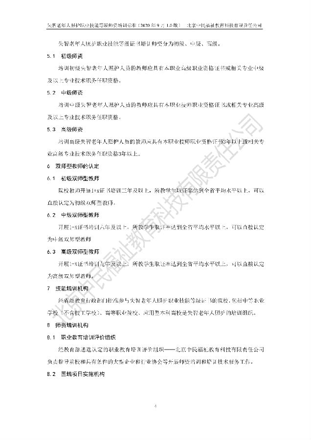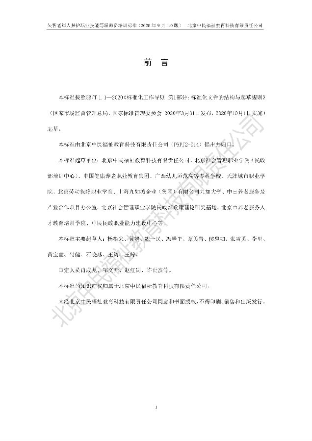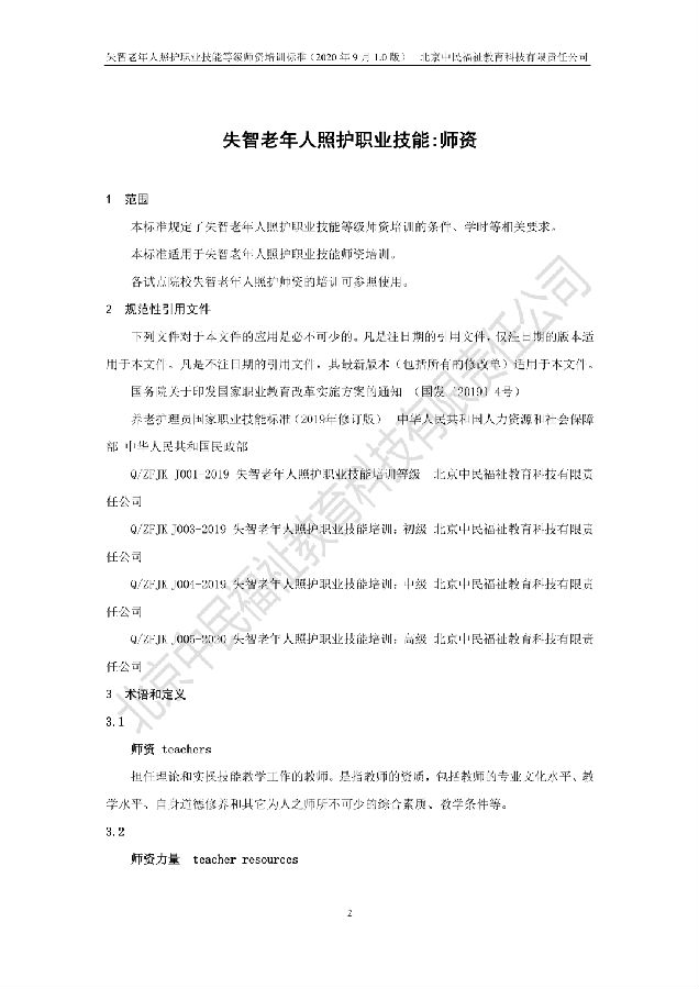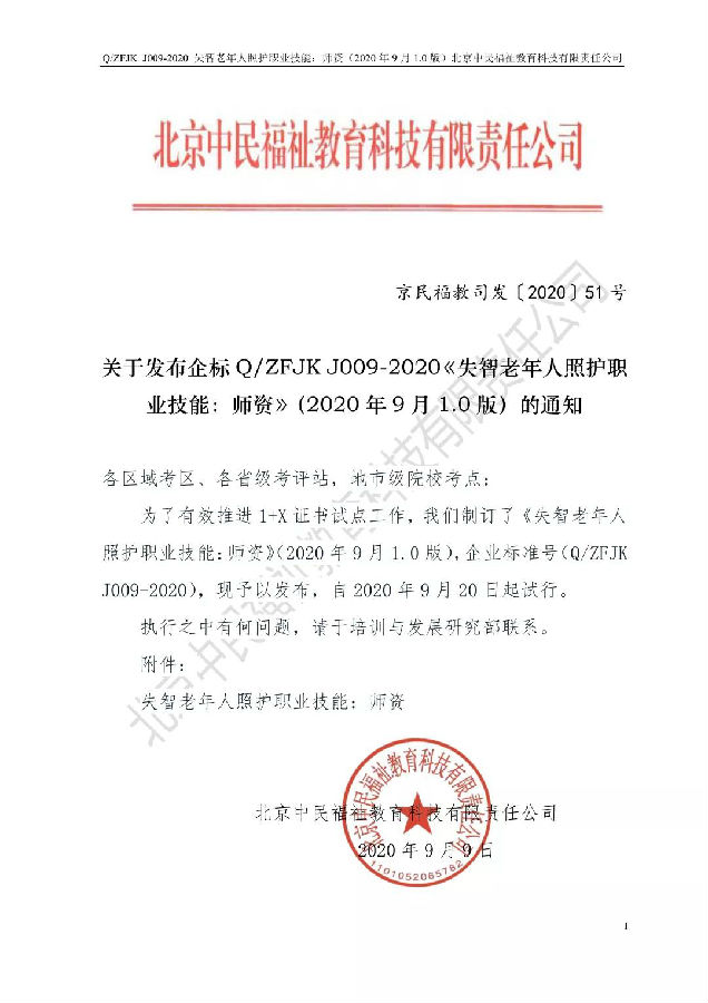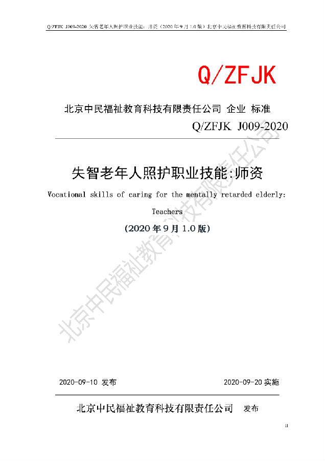 近日,北京中民福祉教育科技有限责任公司作为失智老年人照护职业技能等级证书试点项目培训评价组织,发布企标 QZFJK J009-2020《失智老年人照护职业技能:师资》(2020年9月1.0版),该标准将于2020年9月20日起试行。转载请注明出处。