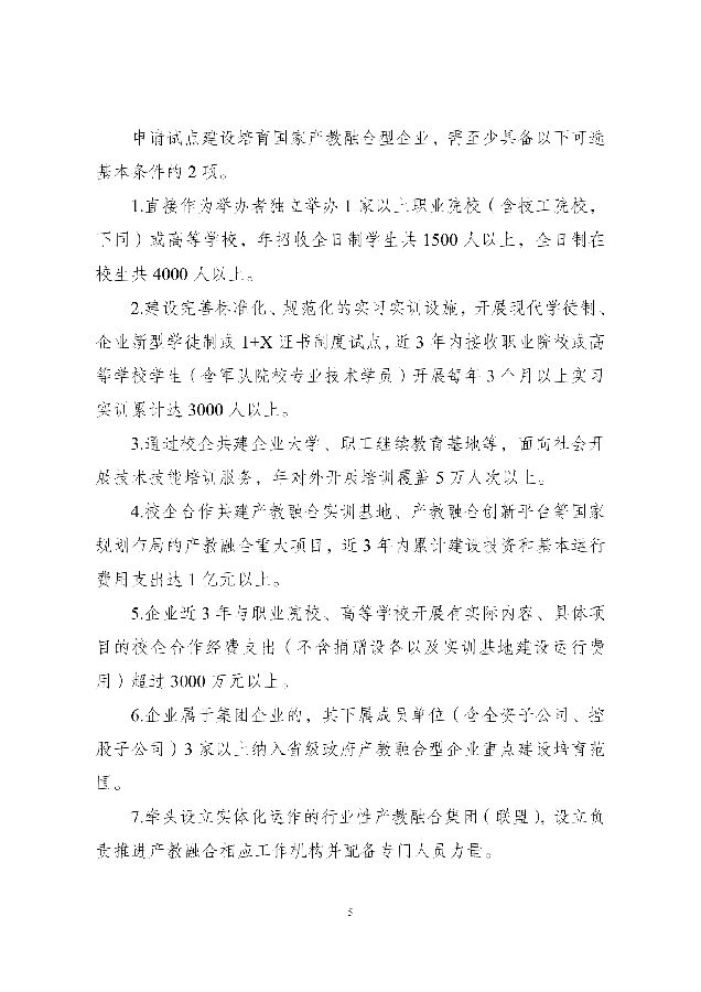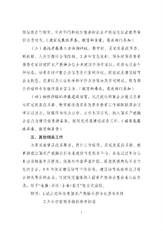 按照《国家产教融合建设试点实施方案》和《建设产教融合型企业实施办法(试行)》要求,国家发展改革委、教育部会同工业和信息化部、财政部、人力资源社会保障部、国务院国资委共同研究制定了《试点建设培育国家产教融合型企业工作方案》,现印发你们,请结合实际,认真抓好落实。