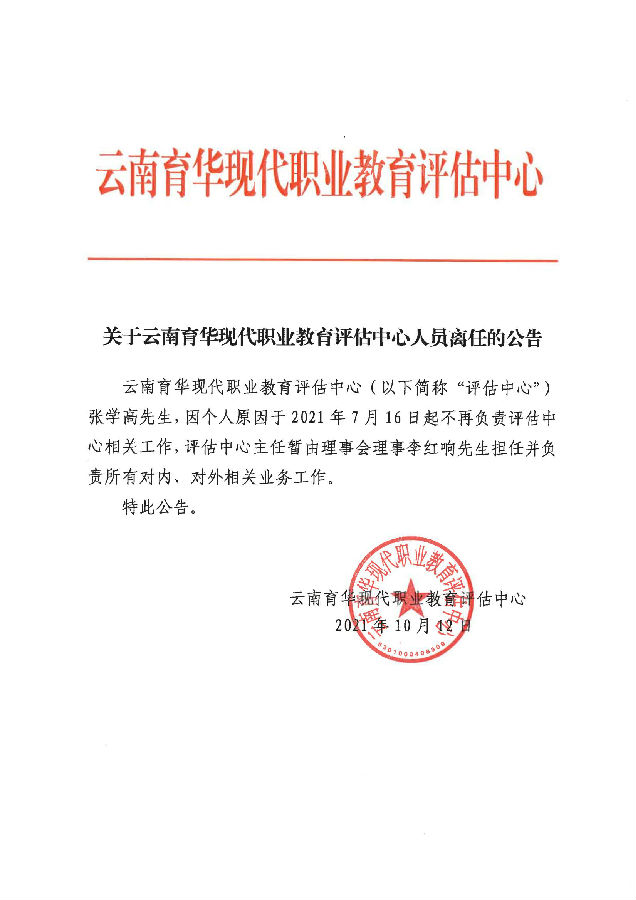 关于云南育华现代职业教育评估中心人员离任的公告