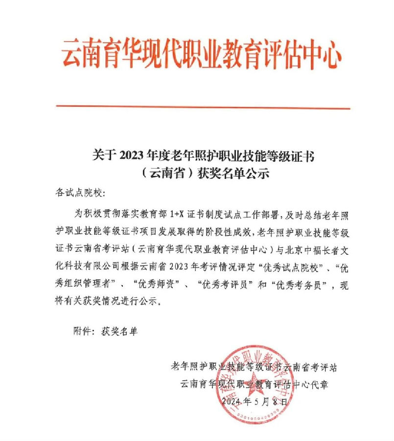关于2023年度老年照护职业技能等级证书(云南省)获奖名单公示