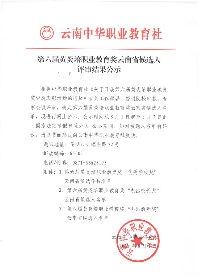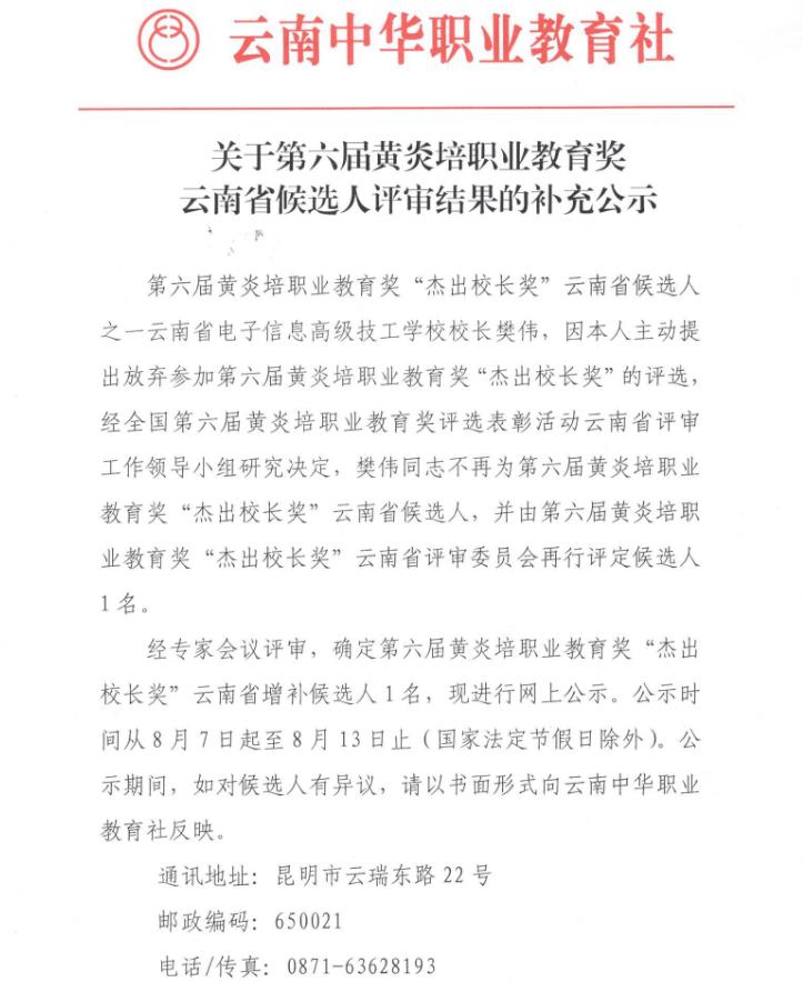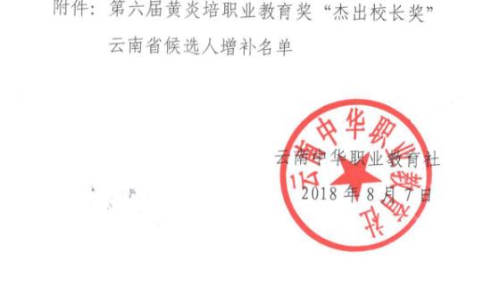 第六届黄炎培职业教育奖云南省候选人评审结果公示与补充公示
