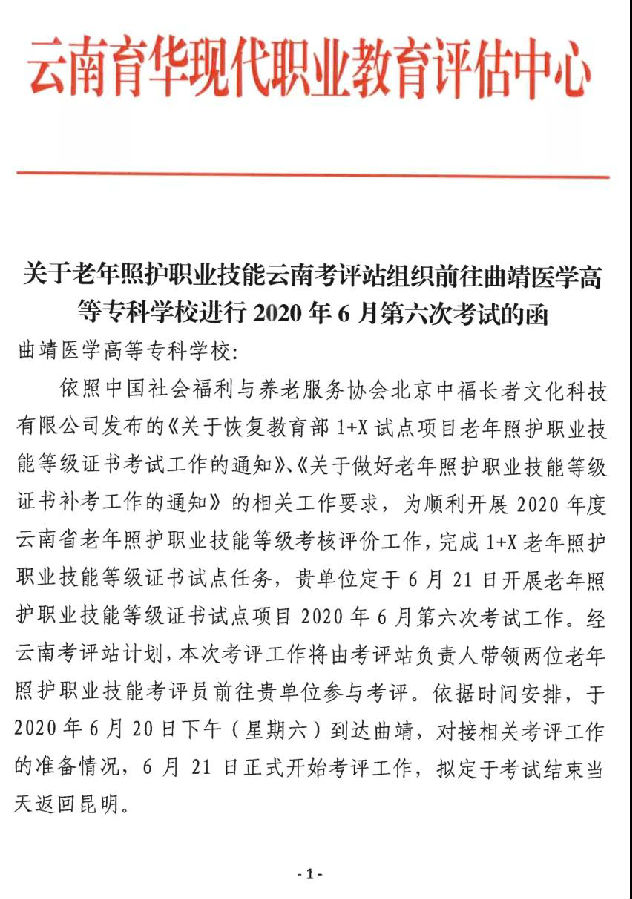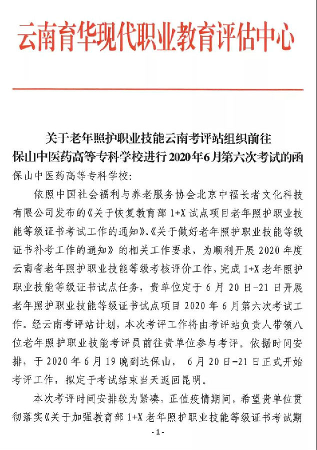 依照中国社会福利与养老服务协会北京中福长者文化科技有限公司(以下简称“中福协”)发布的《关于恢复教育部1+X试点项目老年照护职业技能等级证书考试工作的通知》的相关工作要求,2020年度云南省老年照护职业技能等级证书考核评价工作于6月正式启动。