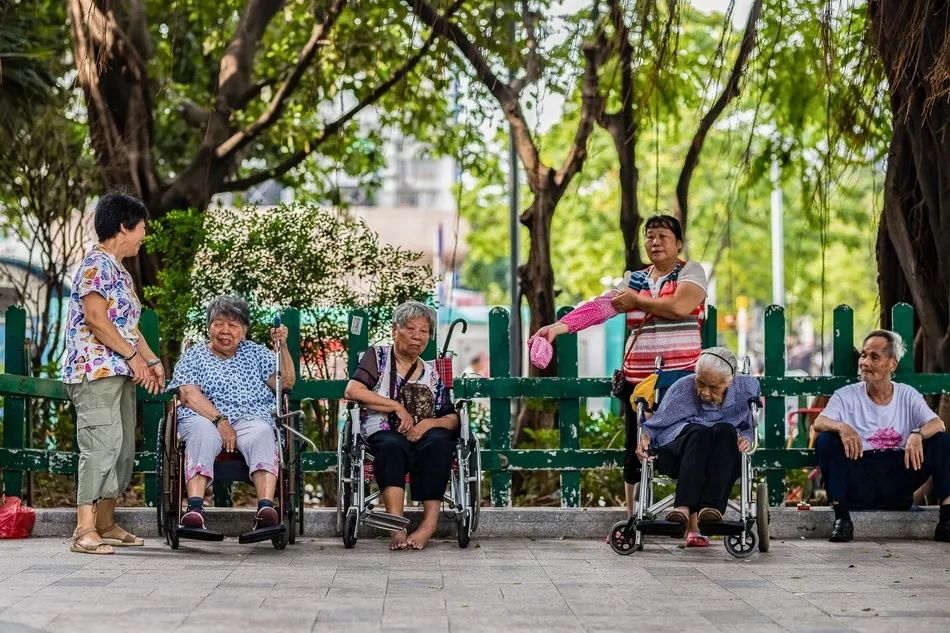2018年6月30日,广州,几个老人在树荫下休闲。随着老龄化社会的一步步推进,雇佣的保姆和家庭护理越来越多地取代了子女的照顾和陪伴。视觉中国 资料图