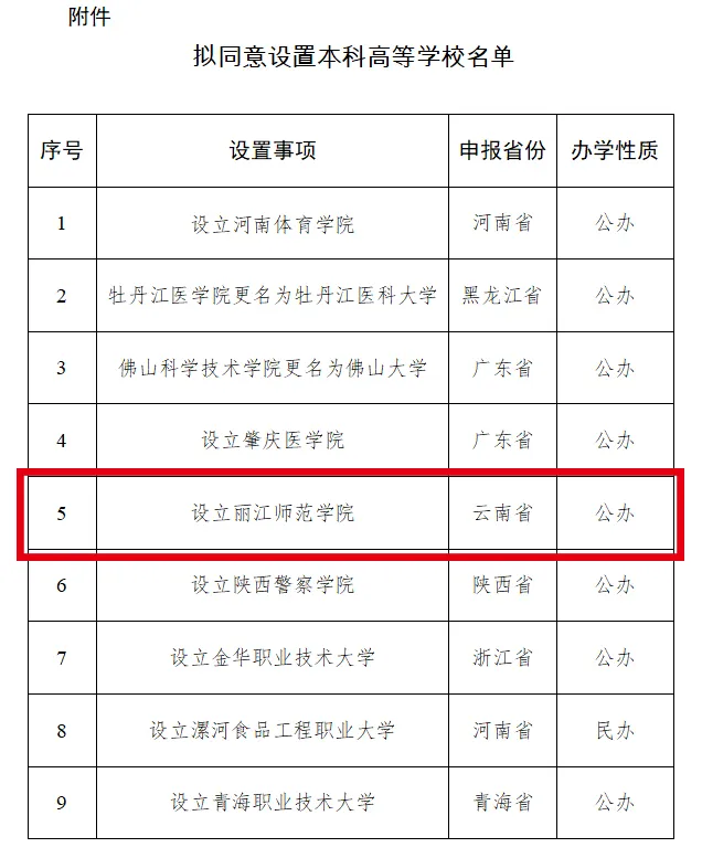 5月13日,教育部网站发布了《关于拟同意设置本科高等学校的公示》,拟同意设置丽江师范学院等9所学校,其中,丽江师范学院在列。详情如下: