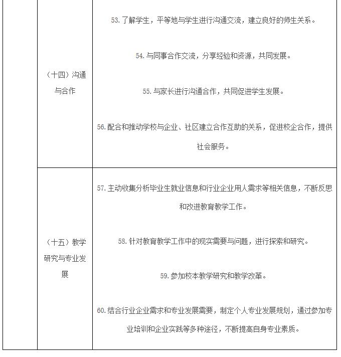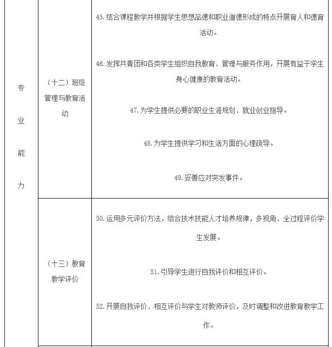 (三)中等职业学校要将《专业标准》作为教师管理的重要依据。制定中等职业学校教师专业发展规划,注重教师职业理想与职业道德教育,增强教师育人的责任感与使命感;开展校本研修,促进教师专业发展;完善教师岗位职责和考核评价制度,健全中等职业学校教师绩效管理机制。