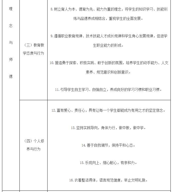 热爱职业教育事业,具有职业理想、敬业精神和奉献精神,践行社会主义核心价值体系,履行教师职业道德规范,依法执教。立德树人,为人师表,教书育人,自尊自律,关爱学生,团结协作。以人格魅力、学识魅力、职业魅力教育和感染学生,做学生职业生涯发展的指导者和健康成长的引路人。