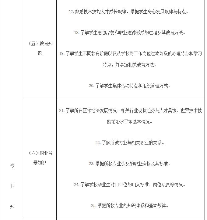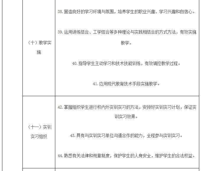 (二)开展中等职业学校教师教育的院校要将《专业标准》作为教师培养培训的主要依据。重视中等职业学校教师职业特点,加强专业建设,深化校企合作;完善教师培养培训方案,科学设置教师教育课程,改革教育教学方式;重视教师职业道德教育,重视职业实践、社会实践和教育实习;加强从事中等职业学校教师教育的师资队伍建设,建立科学的质量评价制度。