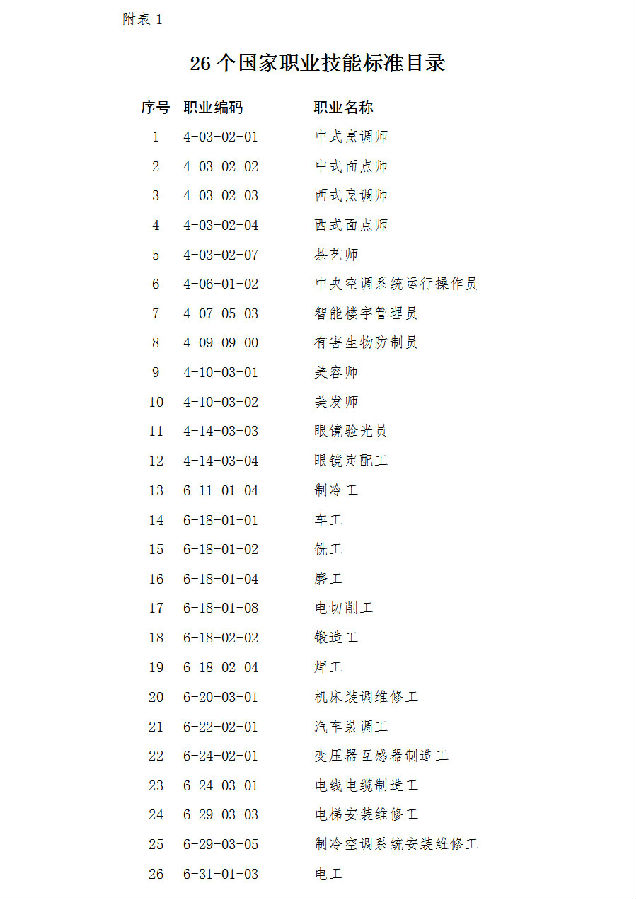 日前,人社部办公厅颁布中式烹调师等26个国家职业技能标准(见附表1)。国家职业技能标准是在职业分类的基础上,根据职业活动内容,对从业人员的理论知识和技能要求提出的综合性水平规定。它是开展职业教育培训和人才技能鉴定评价的基本依据(国家职业技能标准结构图见附表2)。
